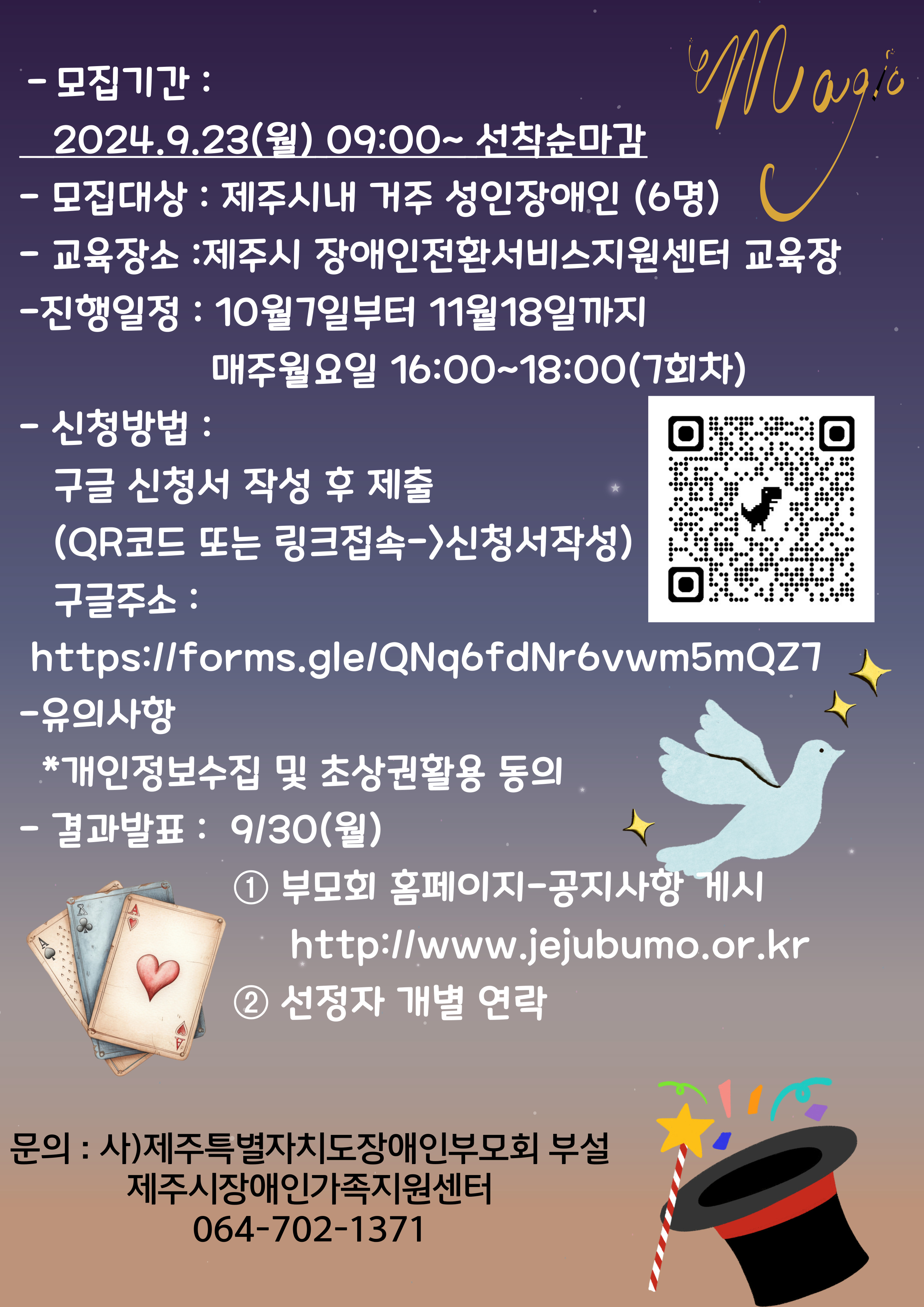 성인기장애인 취미지원사업 마술프로그램에 참여하는 과정에서 과학에 대한 이해를 높이고 마술을 연습함으로써 집중력과 끈기를 배우고 더불어 직접 무대 위에서 펼치는 마술 공연을 통해 자신감과 자존감을 올릴 수 있고 마술을 통해 도전과 희망을 줄 수 있습니다. 많은참여 부탁드립니다.
