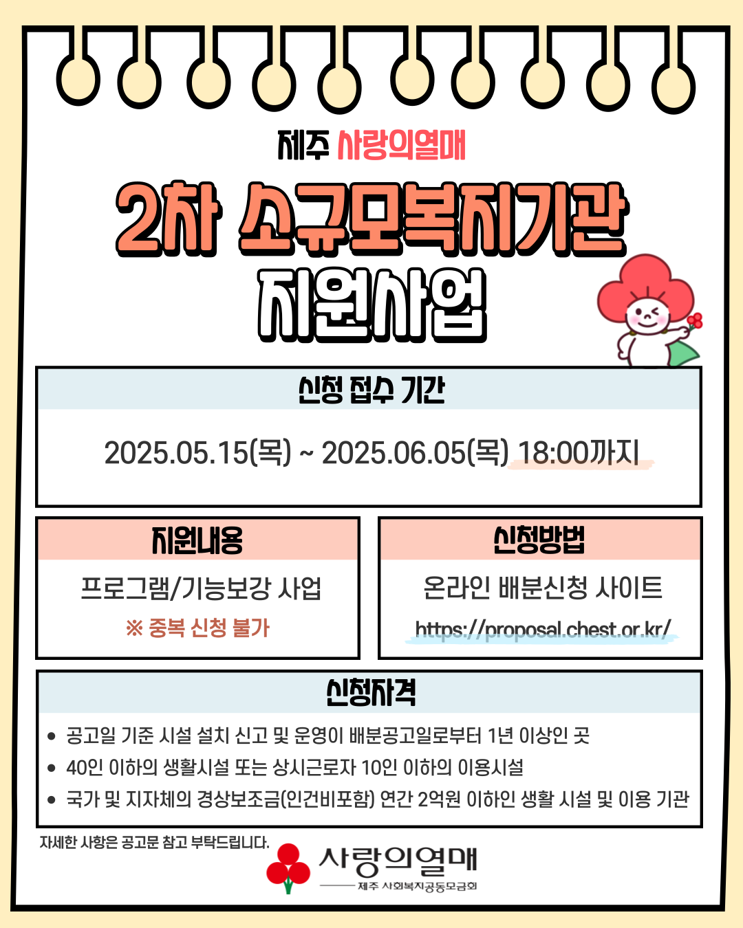 안녕하세요. 제주사랑의열매에서 2025년 2차 소규모복지기관 지원사업을 시행하오니