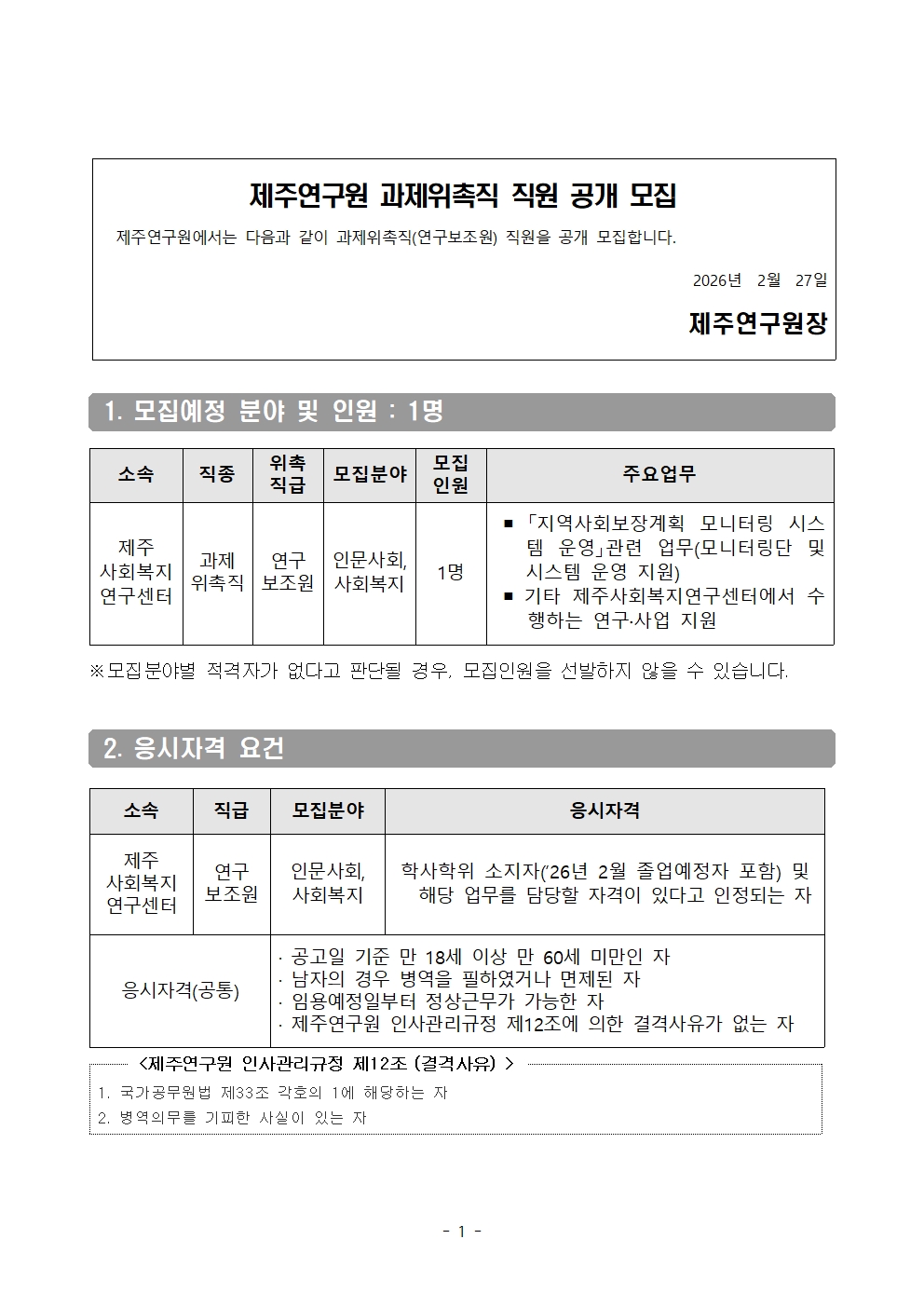 제주연구원 제주사회복지연구센터 과제위촉직(연구보조원) 직원 공개모집