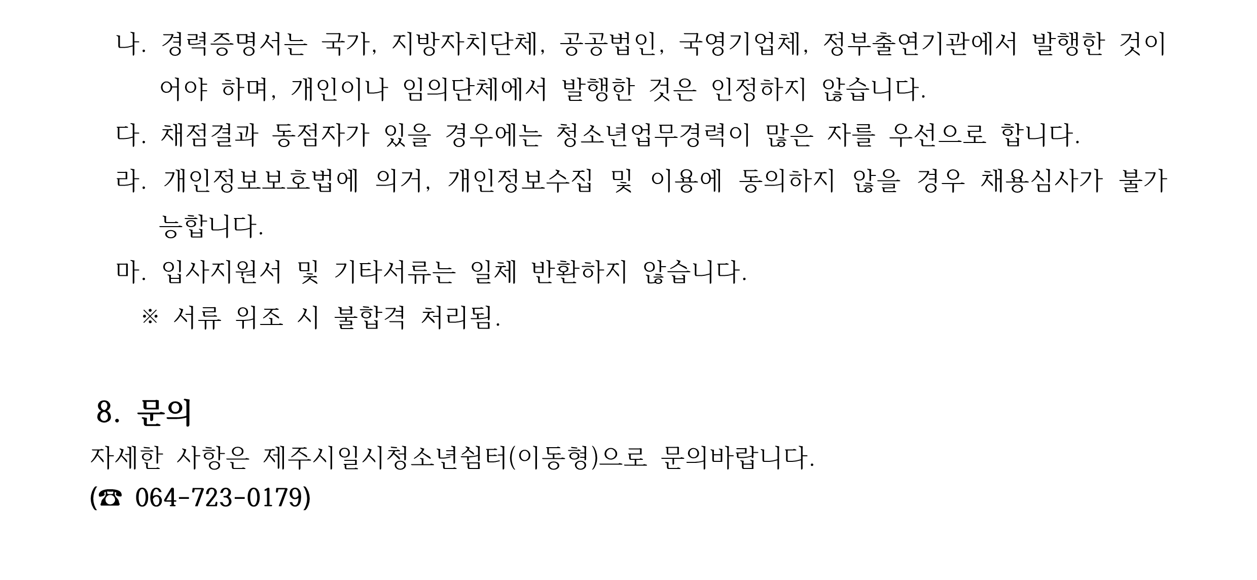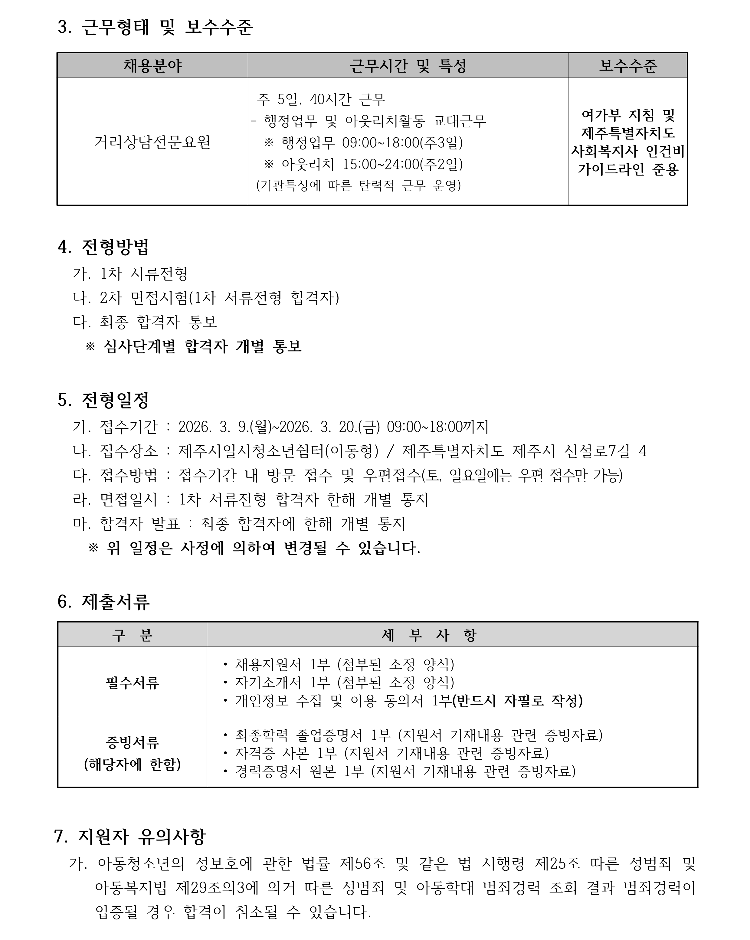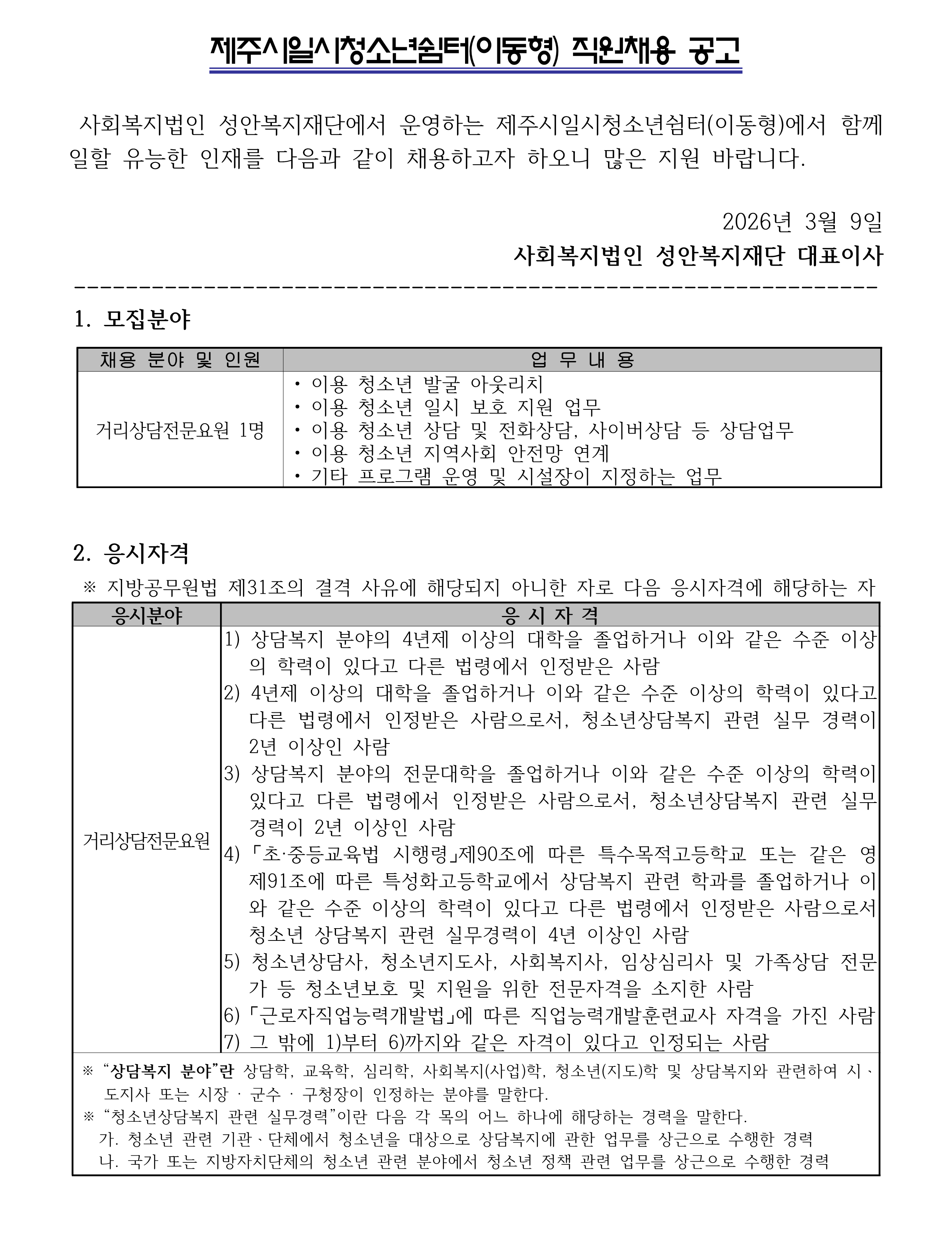 제주시일시청소년쉼터(이동형) 직원채용 공고(거리상담전문요원)