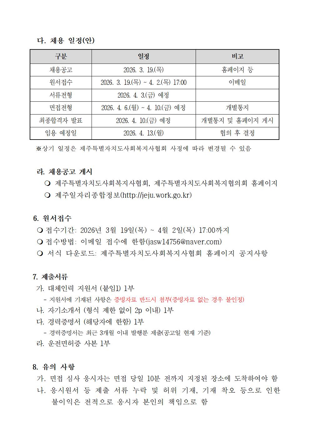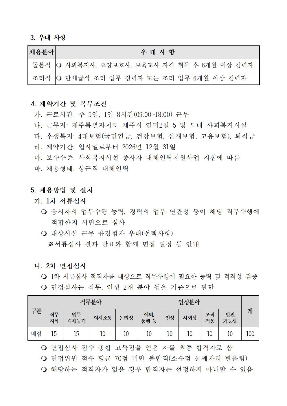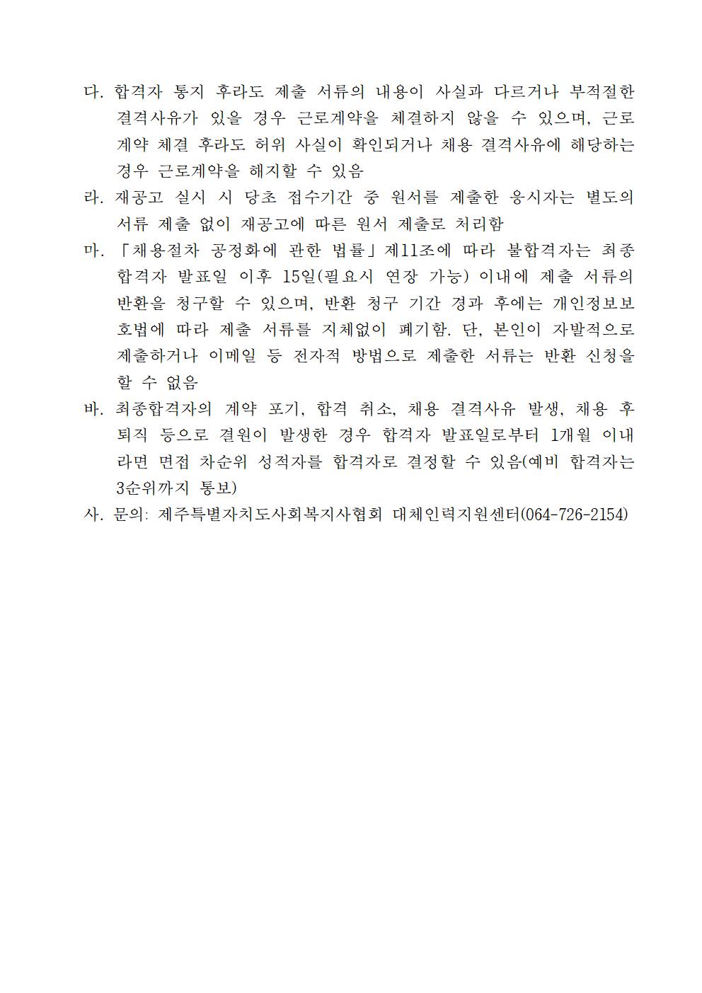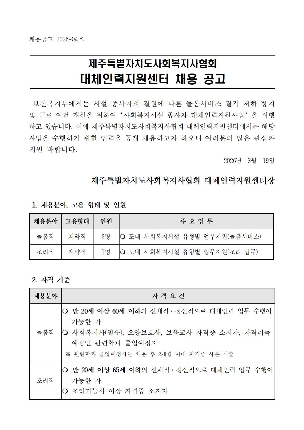 2026년 제3차 제주특별자치도사회복지사협회 대체인력지원센터 채용 공고(돌봄직, 조리직)