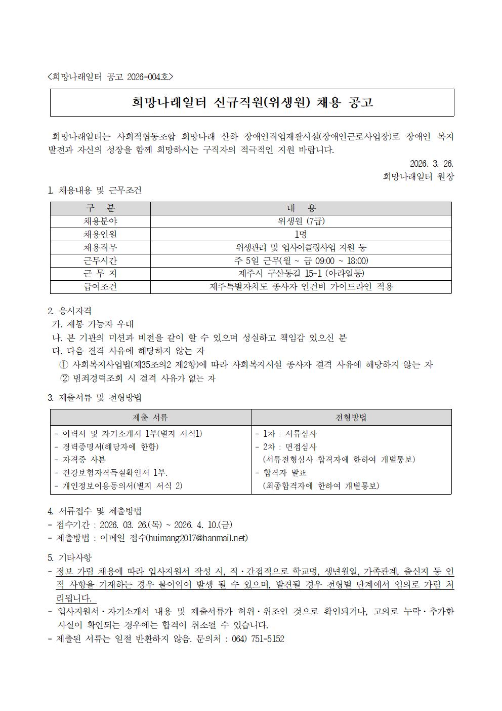 [희망나래일터] 신규직원(위생원) 채용 공고