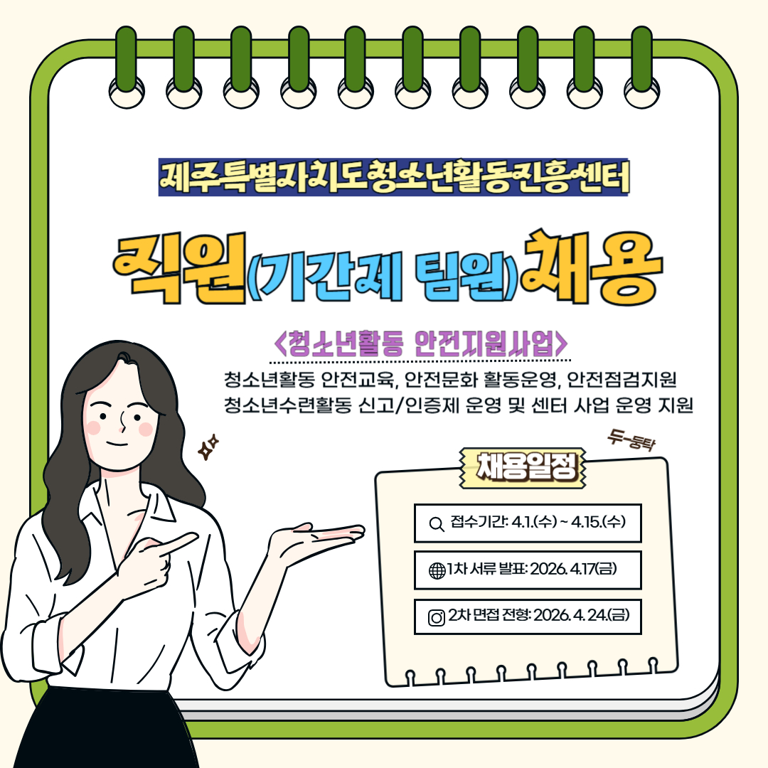 제주특별자치도청소년활동진흥센터 직원 채용을 위하여 아래와 같이 공고하오니 역량 있는 인재들의 많은 지원바랍니다.