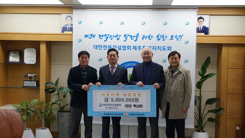 우리 협의회에서는 지난 12. 27일 대한전문건설협회 제주특별자치도지회(회장 백상훈)에서 이웃 사랑 성금으로 500만원을 기부해 주셨습니다.