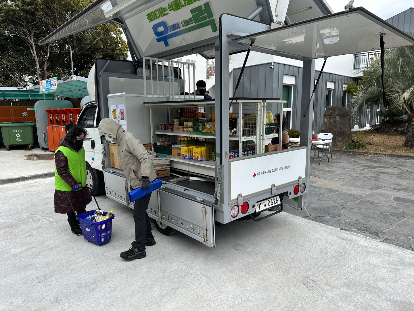직접 찾아가 이동형 편의점 형태의 차량(1t트럭 개조)을 통해 기부식품을 제공하고