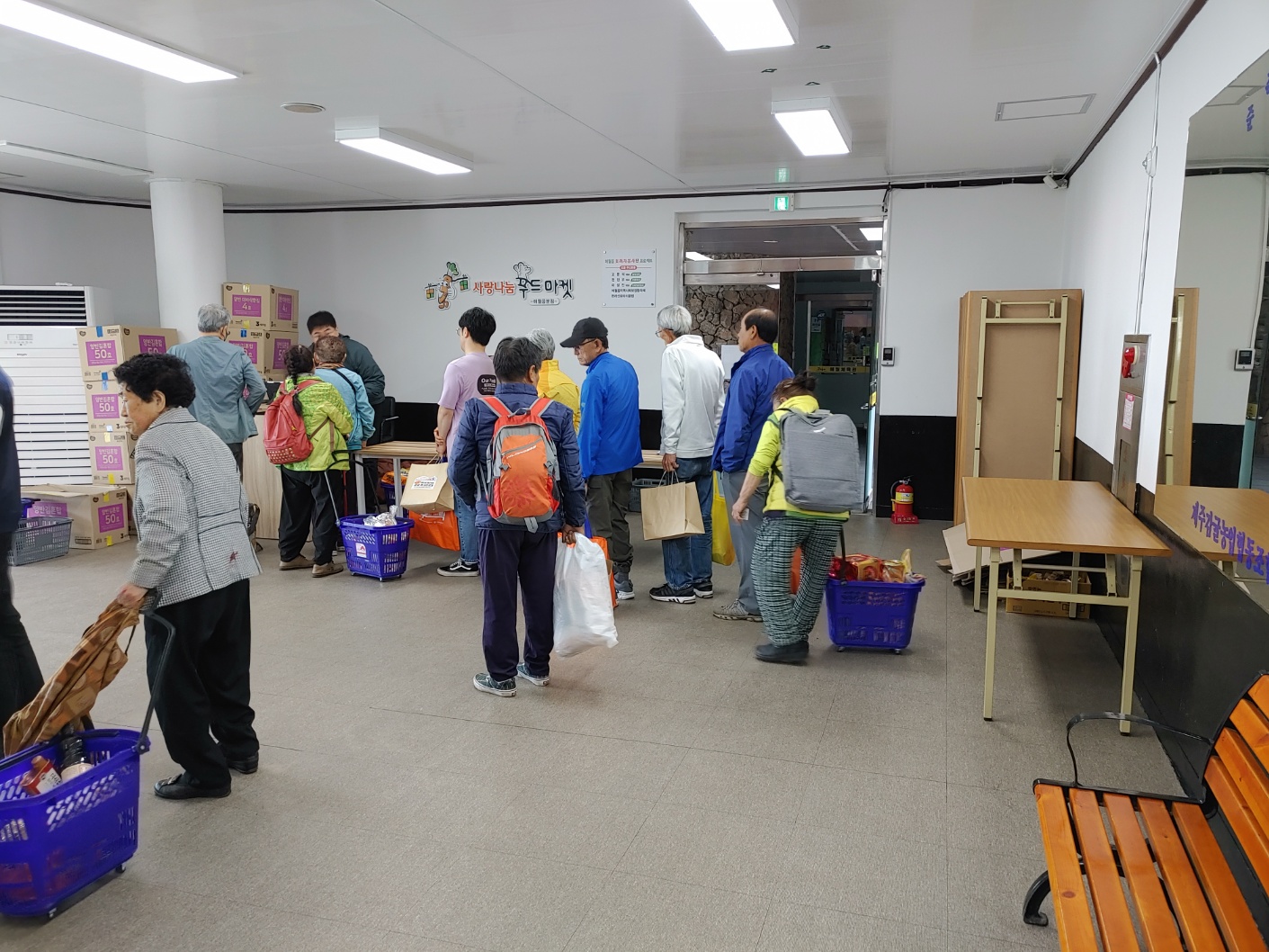 제공해주신 장소인 애월체육관 별관급식소로 물품들을 트럭으로부터 옮겨서 진열을 합니다.