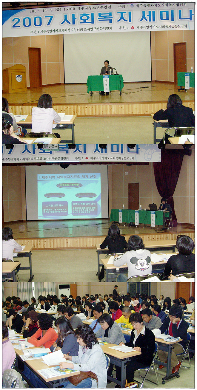 우리 협의회 조사연구전문위원회(위원장 : 홍연숙 교수)가 주관한 <2007 사회복지 세미나>가 지난 11. 9(금) 사회복지 관계자 180여명이 참석한 가운데 제주시 청소년수련관 다목적실에서 개최되었습니다.