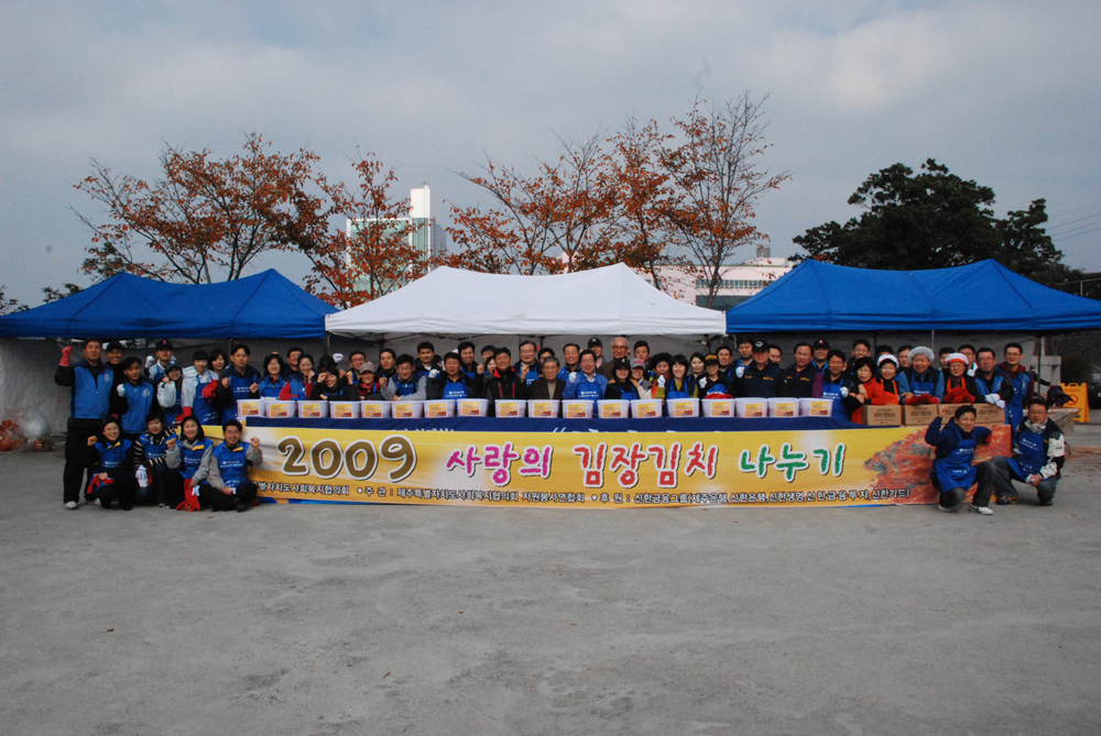 제주특별자치도사회복지협의회(회장 이동한)는 11월 28일 협의회 회관에서 우리 협의회 자원봉사자들과 신한금융그룹 직원들의 참여로 '2009 사랑의 김장김치 나누기' 행사를 가졌습니다.