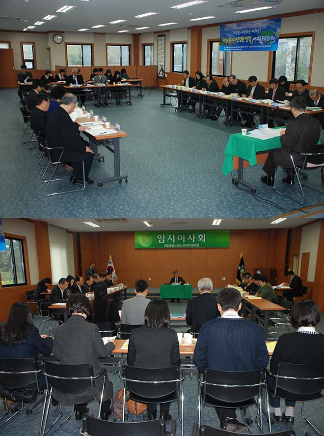 2010년도 제2차 임시이사회가 지난 11. 15(월) 11:00 사회복지협의회 삼다수홀에서 개최되었다. 이 날 회의에서는 협의회와 아라복지관의 추가경정 세입세출예산(안)과 협의회 제5대 회장 등 선거일 지정(안), 선거관리위원회 구성(안) 심의가 이뤄졌다.