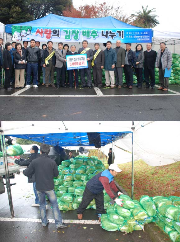 우리 협의회는 12월 2일 제주종합경기장 야외광장에서 ㈔전국농산물산지유통인제주연합회(회장 최도균)로부터 지원받은 김장용 배추 5400포기를 직능별 사회복지단체와 자원봉사단체 등에 배분했습니다.