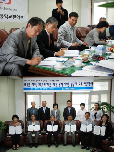 화북동 지역의 아동들의 건강한 성장을 도모하기 위한 지역기관 교육공동체 구축 협약식이 5월16일 화북초등학교에서 있었다.