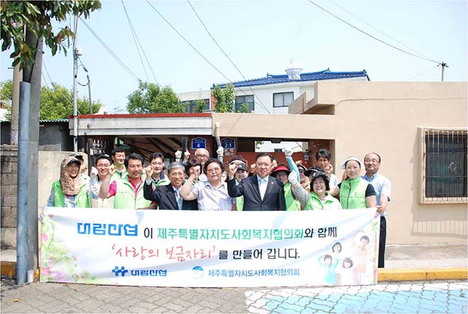 제주특별자치도사회복지협의회(회장 이동한)와 대림산업(주)이 공동 주관하는 저소득가구 주거환경개선사업 '사랑의 보금자리 만들기'가 6. 8일 대림산업(주) 관계자 및 협의회 자원봉사자 등 총 20여명이 참석한 가운데 발대식을 실시하였다.
