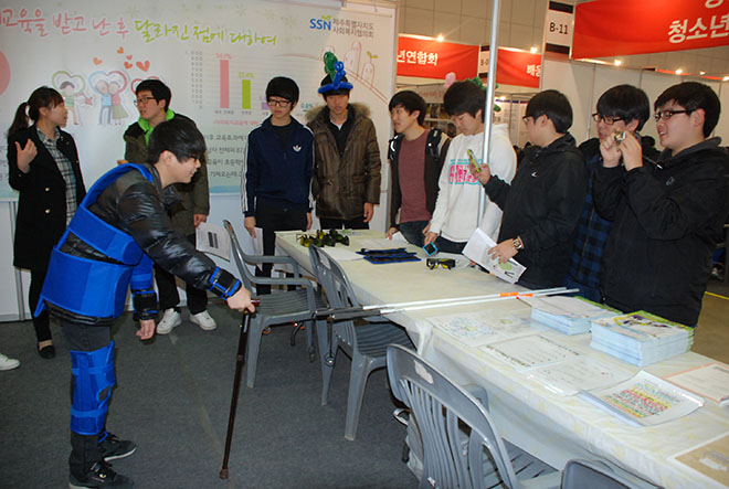 지난 3. 16일부터 18일까지 경기도 고양시 일산 킨텍스에서 개최된 '2012 대한민국 교육기부 박람회'에 참가하여 '찾아가는 초등학생 복지교육'사업내용 전반에 대해 홍보하고 부스방문자를 대상으로 장애 및 노인체험활동 진행을 통해 큰 호응을 얻었습니다.