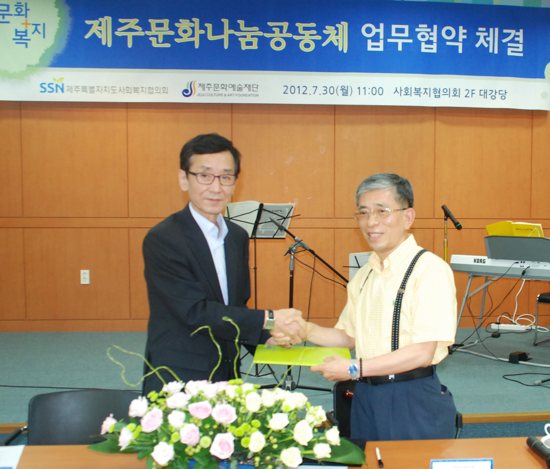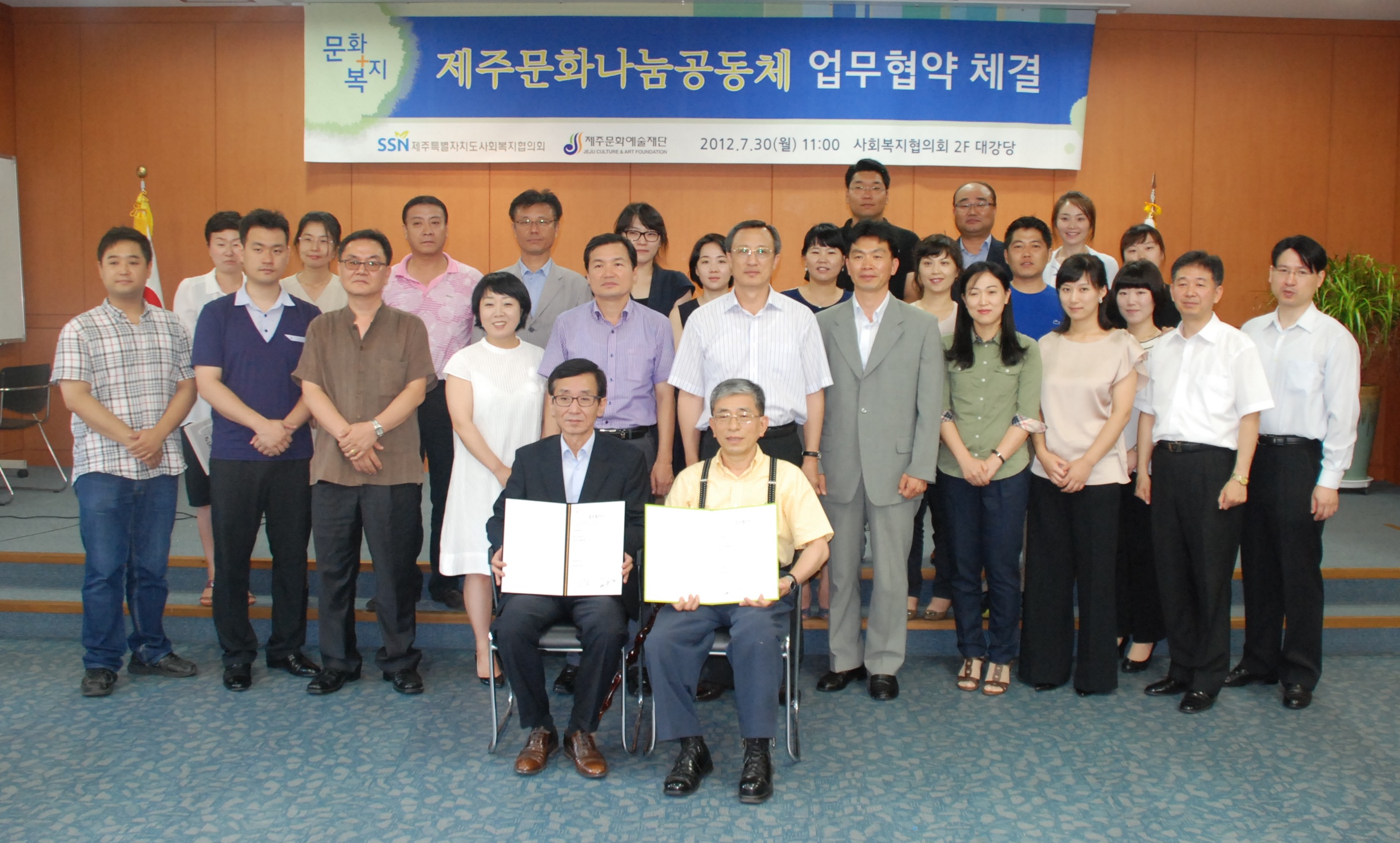 제주특별자치도사회복지협의회(회장 이동한)와 제주문화예술재단(이사장 양영흠)이 7월 30일 사회복지협의회 삼다수홀에서 소외계층에게 문화예술 향유 기회를 제공하기 위해 '제주문화나눔공동체' 업무협약을 체결했습니다.