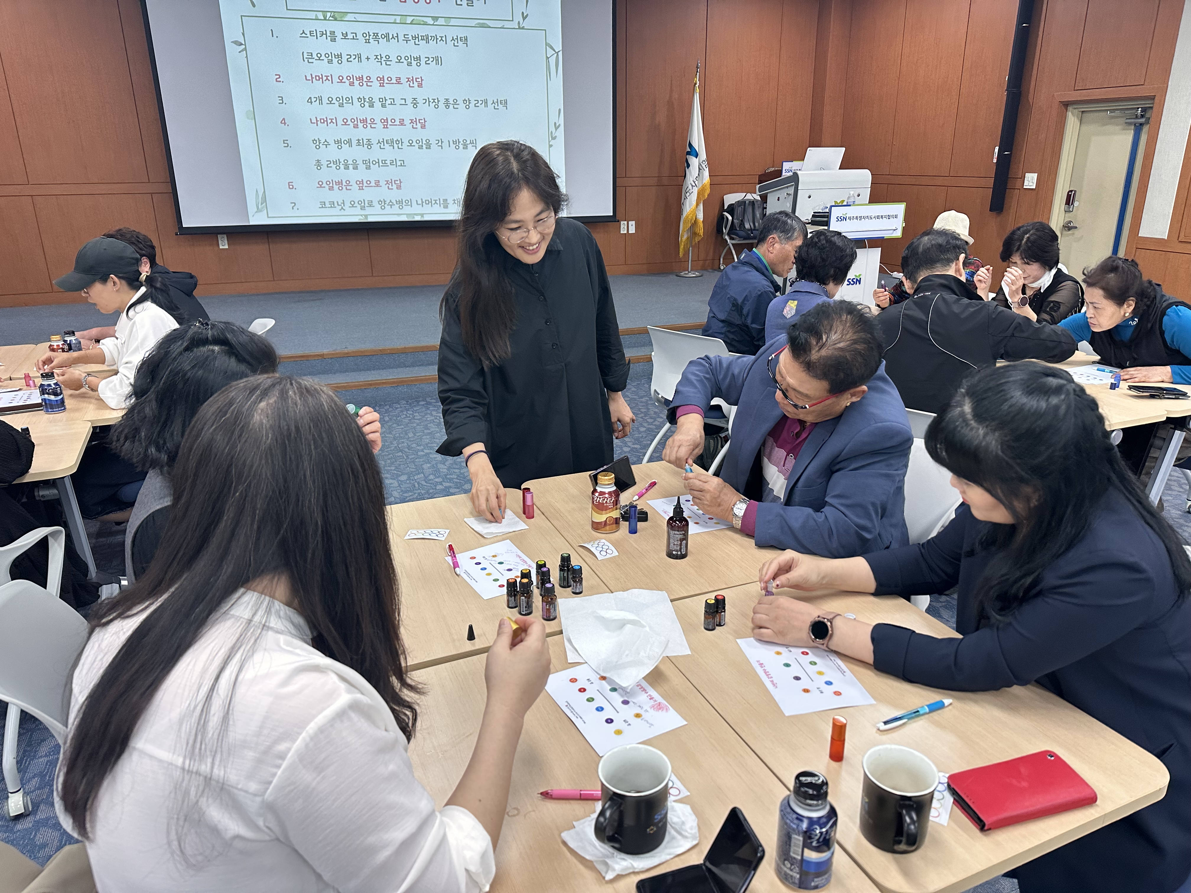 이번 교육주제는 김윤희 강사(인의향마음경영연구소)의 '아로마테라피-나만의 감정향수만들기'로 내용은 아로마오일이 심리신체에 미치는 영향, 에센셜아로마를 활용한 심리신체진단, 나만의 감정 테라피 향수 만들기 등으로 진행됐습니다💕