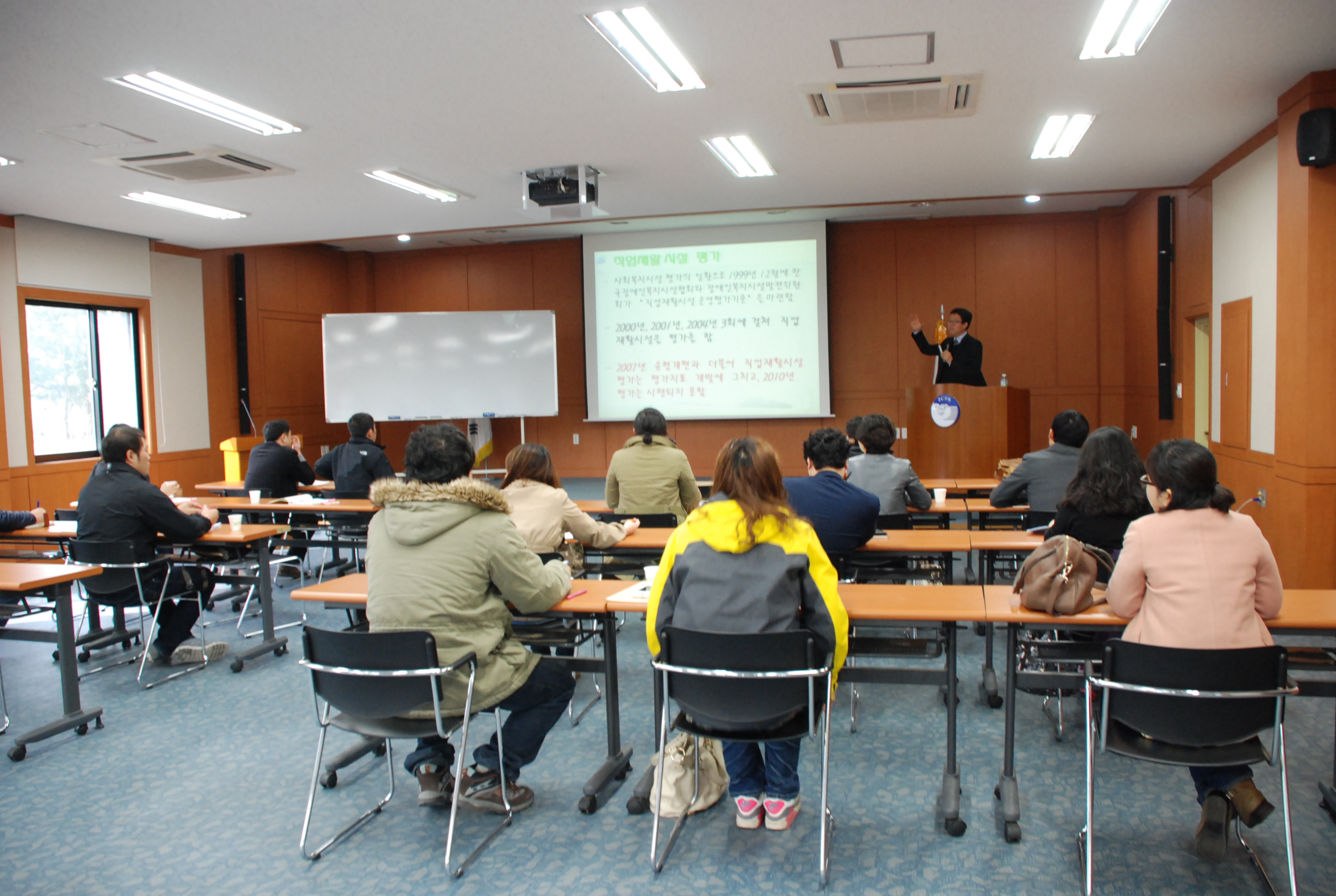 우리 협의회에서는 3월 8일 장애인직업재활시설 분과위원장 김동주(우석대학교 재활학과)교수님을 초빙, 삼다수홀에서 장애인직업재활시설 종사자 21명을 대상으로 '사회복지시설평가지표설명회(장애인직업재활시설)'를 실시하였습니다.