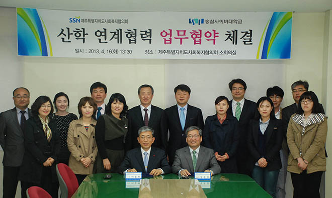 4. 16 (화) 제주특별자치도사회복지협의회(회장 이동한)와 숭실사이버대학교(부총장 정무성)은 온,오프라인 연계교육과정의 개발 및 운영, 실습지도 연계, 학술정보 및 자료의 상호교환활용 등 상호협력을 목적으로 업무협약을 체결하였다.