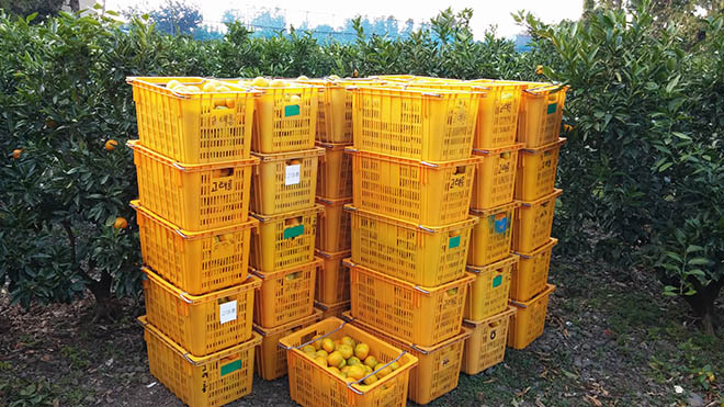 한통의 전화를 받고 달려간 곳에는 가지런히 정리된 감귤 콘테나가 저를 맞이하였습니다.