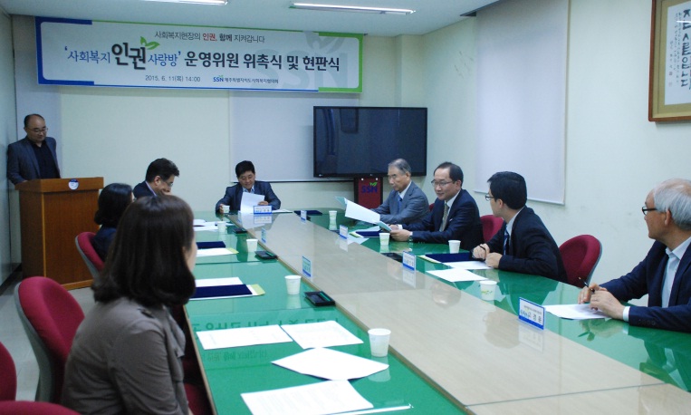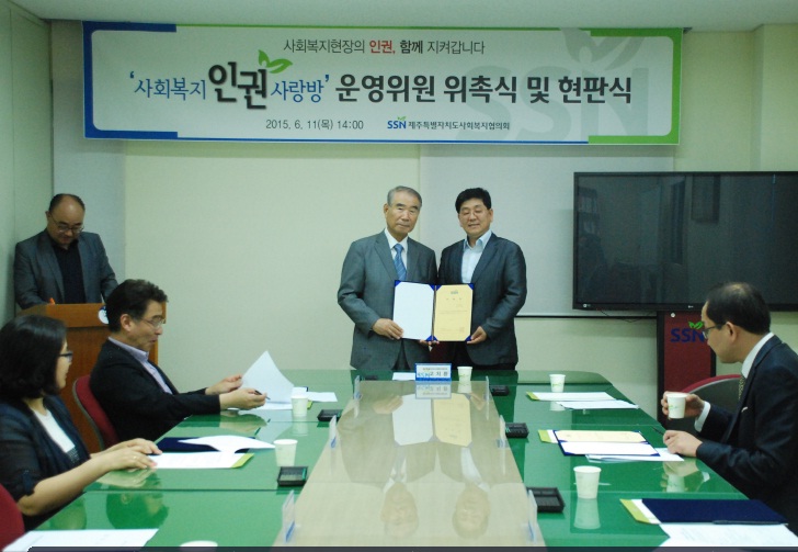 제주특별자치도사회복지협의회(회장 고치환)는 사회복지현장 이용자 및 종사자를 위한 법률 상담 및 지원, 인권교육 등을 수행하는 ‘사회복지인권사랑방(운영위원장 고관용)’ 현판식 및 운영위원 위촉식을 지난 11일 열습니다.