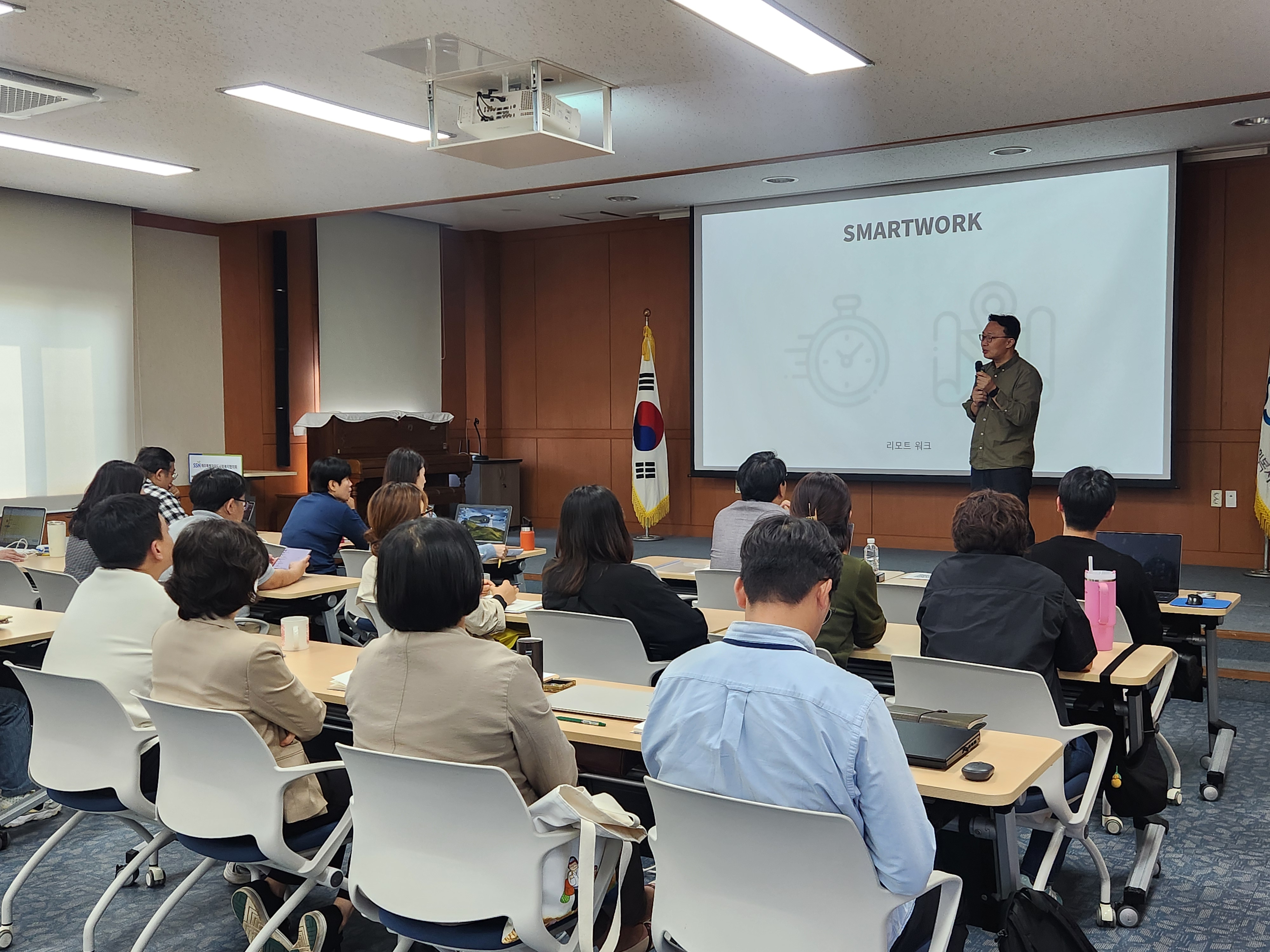 먼저 김종원 대표님(소셜프리즘)께서 '스마트 워크란 무엇인가?'를 주제로 강의를 진행해주셨고, 이후 도내 3개 종합사회복지관(아라종합사회복지관, 동제주종합사회복지관, 서귀포시서부종합사회복지관)의 활용 사례와 더불어 도외 기관들의 사례도 간략히 소개되었습니다.