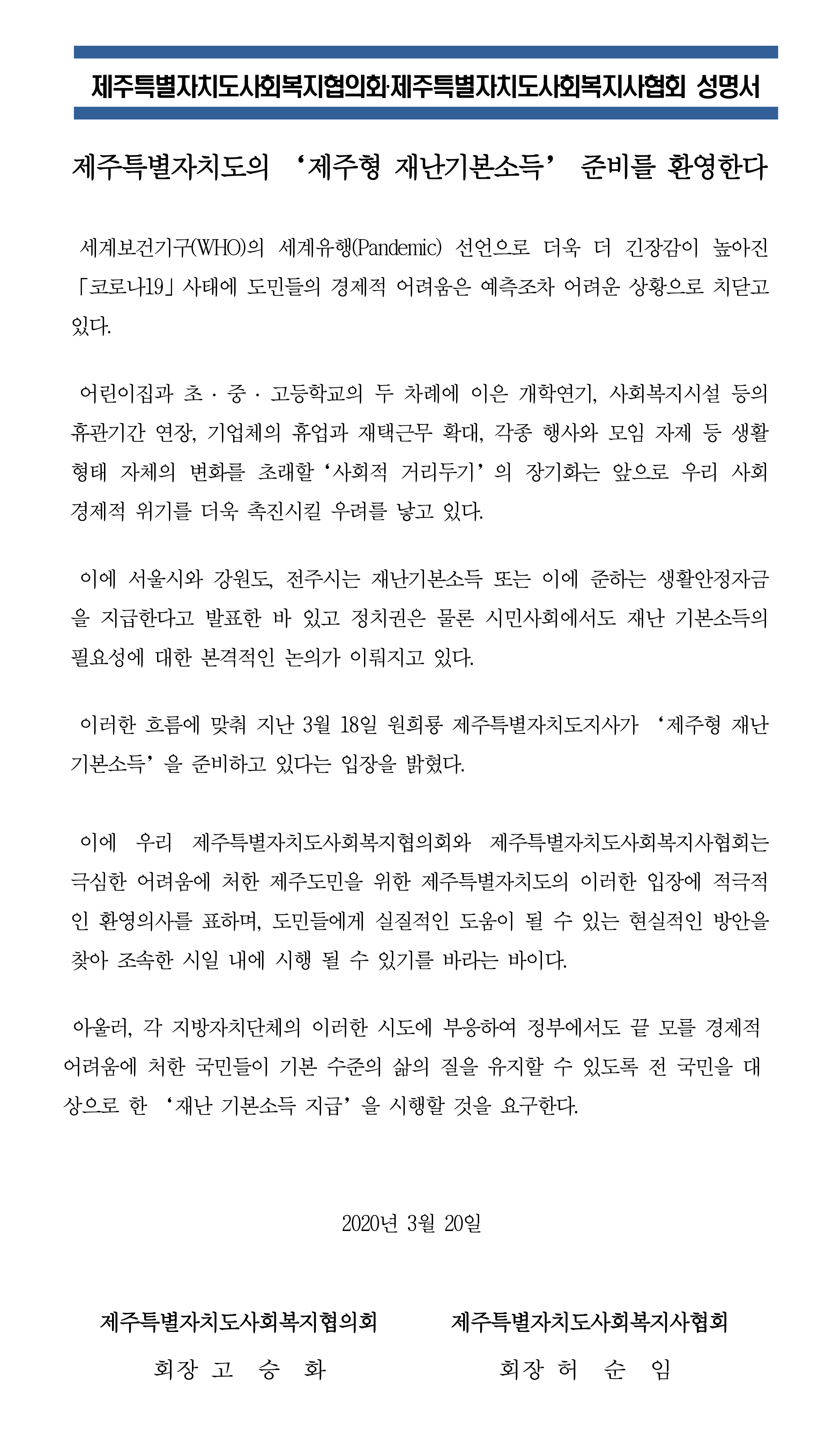 우리 협의회와 제주특별자치도사회복지사협회에서는 지난 3. 18일 제주특별자치도지사가 '제주형 재난 기본소득'을 준비하겠다는 입장에 환영의사를 표명하고 조속한 시행을 바라는 성명서를 금일(3. 20) 발표하였습니다.