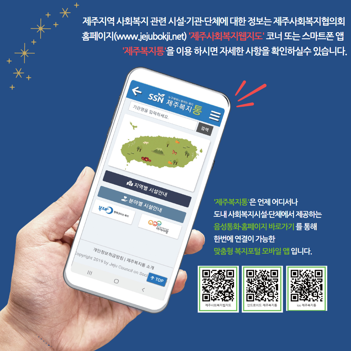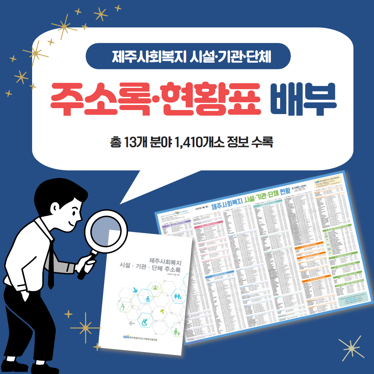 제주지역 사회복지 관련 시설·기관·단체에 대한 정보를 수록한 '제주 사회복지시설·단체 주소록 및 현황표(2020. 7월기준)’가 나왔습니다. 주소록과 현황표에는 13개분야 1410개소의 다양한 정보를 한눈에 살펴볼수 있습니다. 관심있거나 필요하신분은 참고하시기 바랍니다.^^