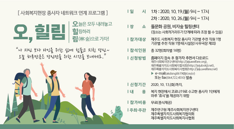 우리 협의회와 제주연구원 제주사회복지연구센터, 제주특별자치도사회복지사협회에서 공동주관하는 종사자 힐링 프로그램 「오, 힐림」의 참가자를 아래와 같이 모집하오니 많은 관심과 신청바랍니다.