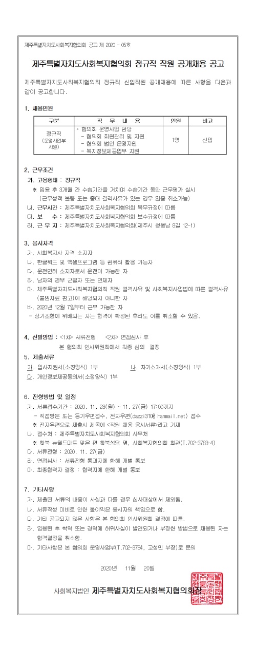 제주특별자치도사회복지협의회 정규직 신입직원 채용공고
