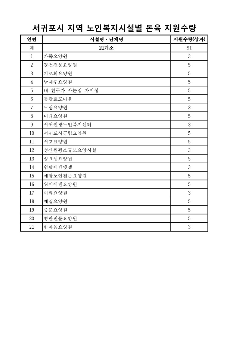 서귀포시 관내 노인복지(생활)시설 돈육 배분 수량 및 인수증 서식