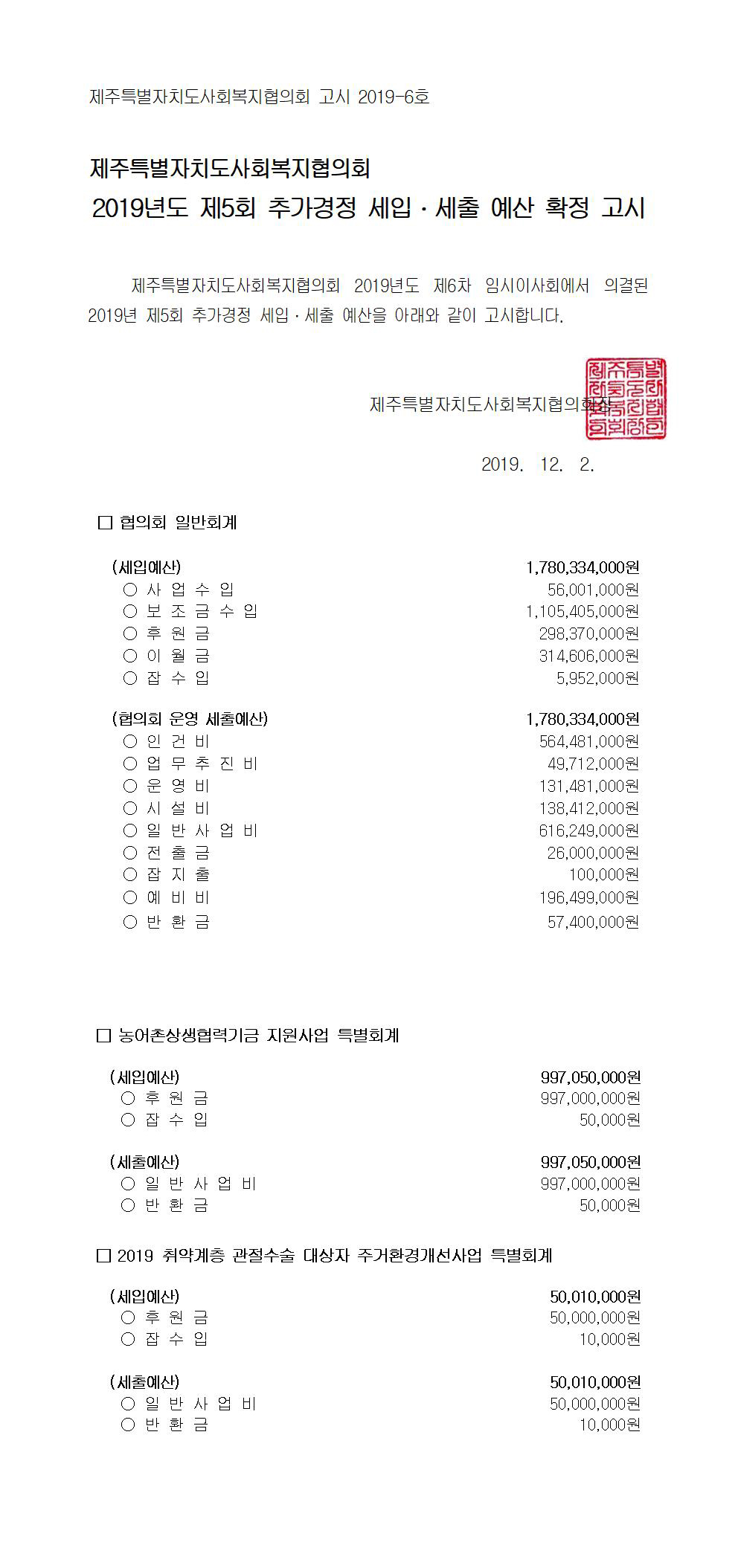 2019년도 제5회 추가경정 세입세출 예산고시