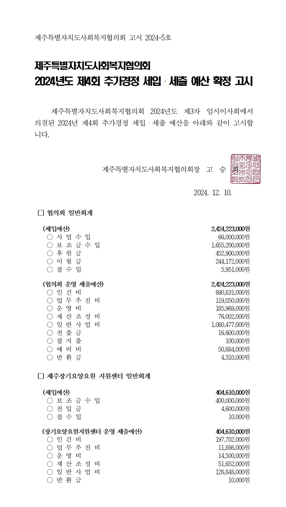 2024년도 제4회 추가경정 세입세출 예산고시