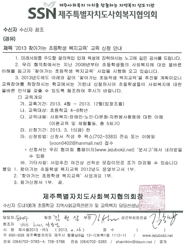 '2013 찾아가는 초등학생 복지교육' 신청 안내