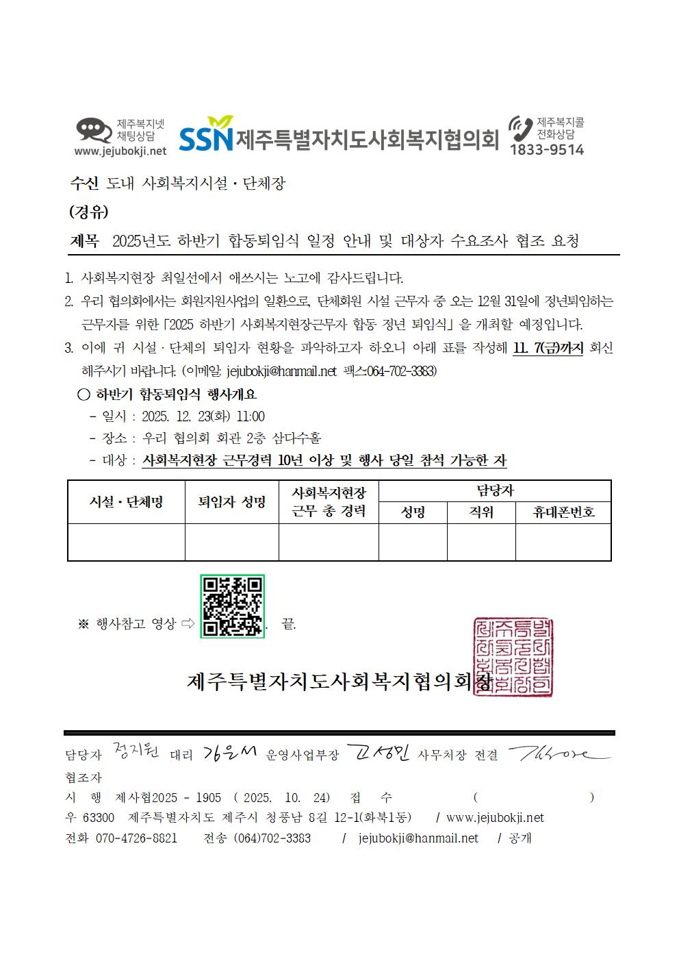 2025년도 하반기 합동퇴임식 일정 안내 및 대상자 수요조사 협조 요청