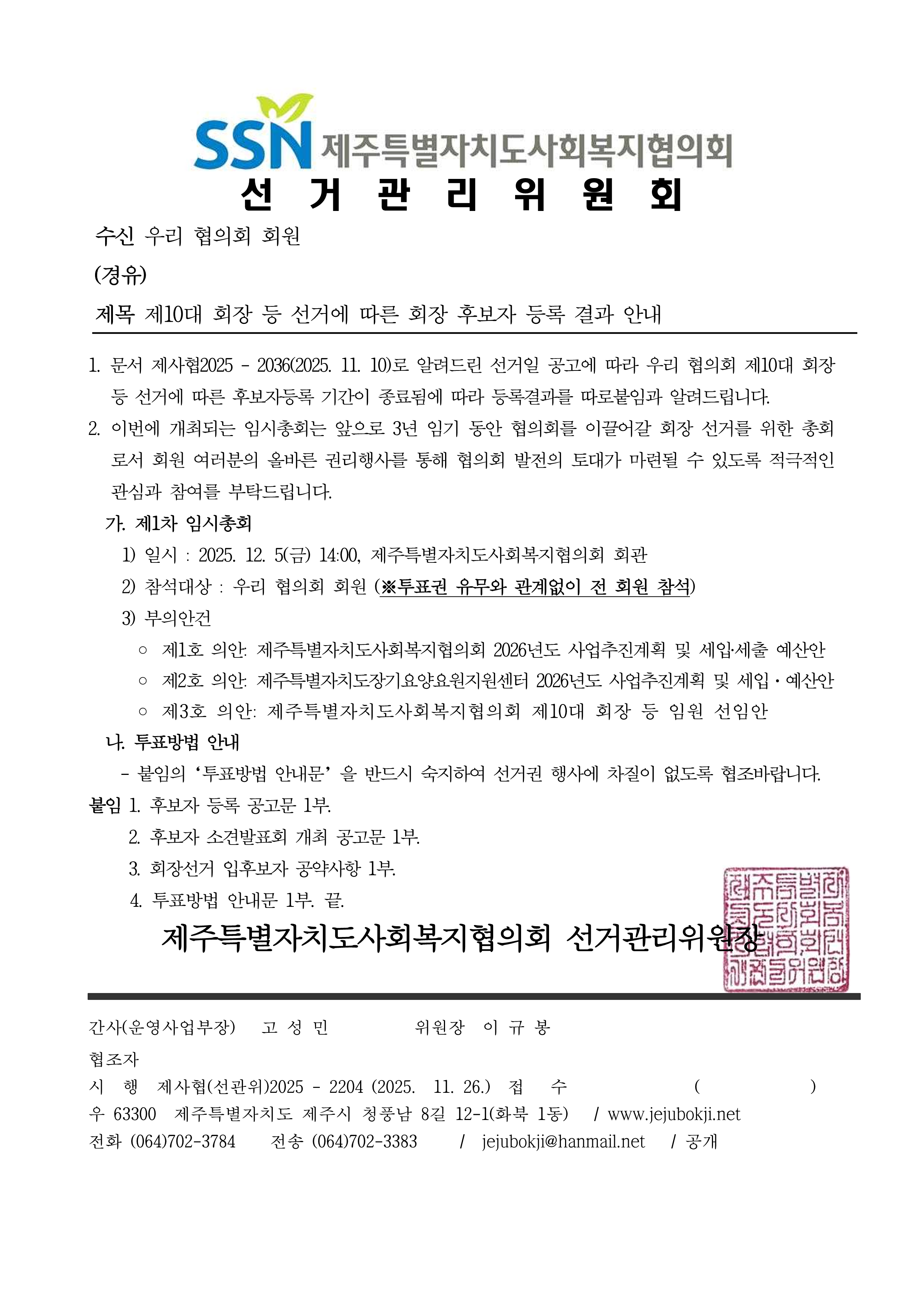 제주특별자치도사회복지협의회 제10대 회장 선거 후보자 등록결과 안내