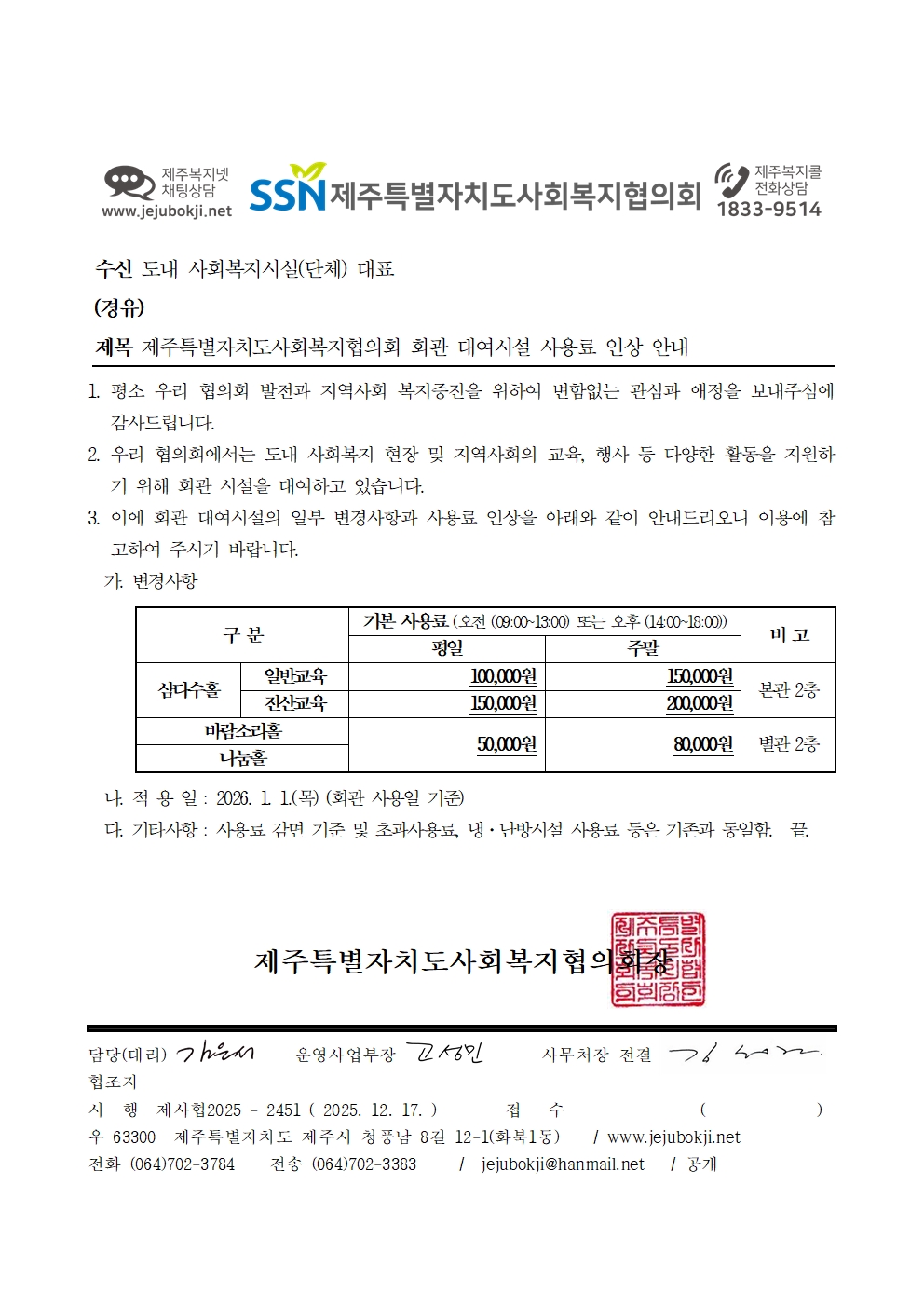 제주특별자치도사회복지협의회 회관 대여시설 사용료 인상 안내