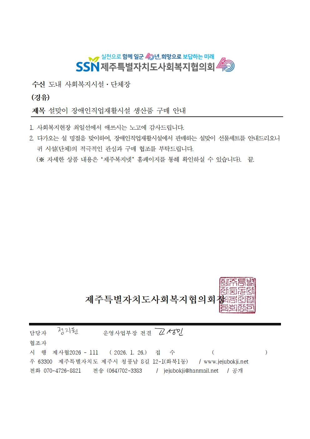 설맞이 장애인직업재활시설 생산품 구매 안내