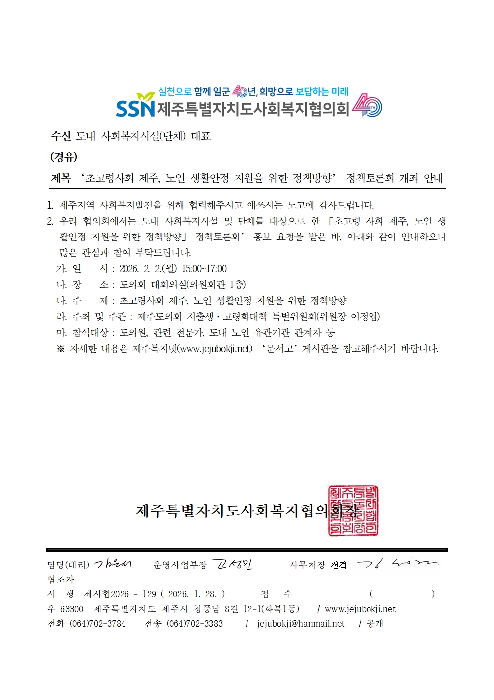 '초고령사회 제주, 노인 생활안정 지원을 위한 정책방향' 정책토론회 개최 안내