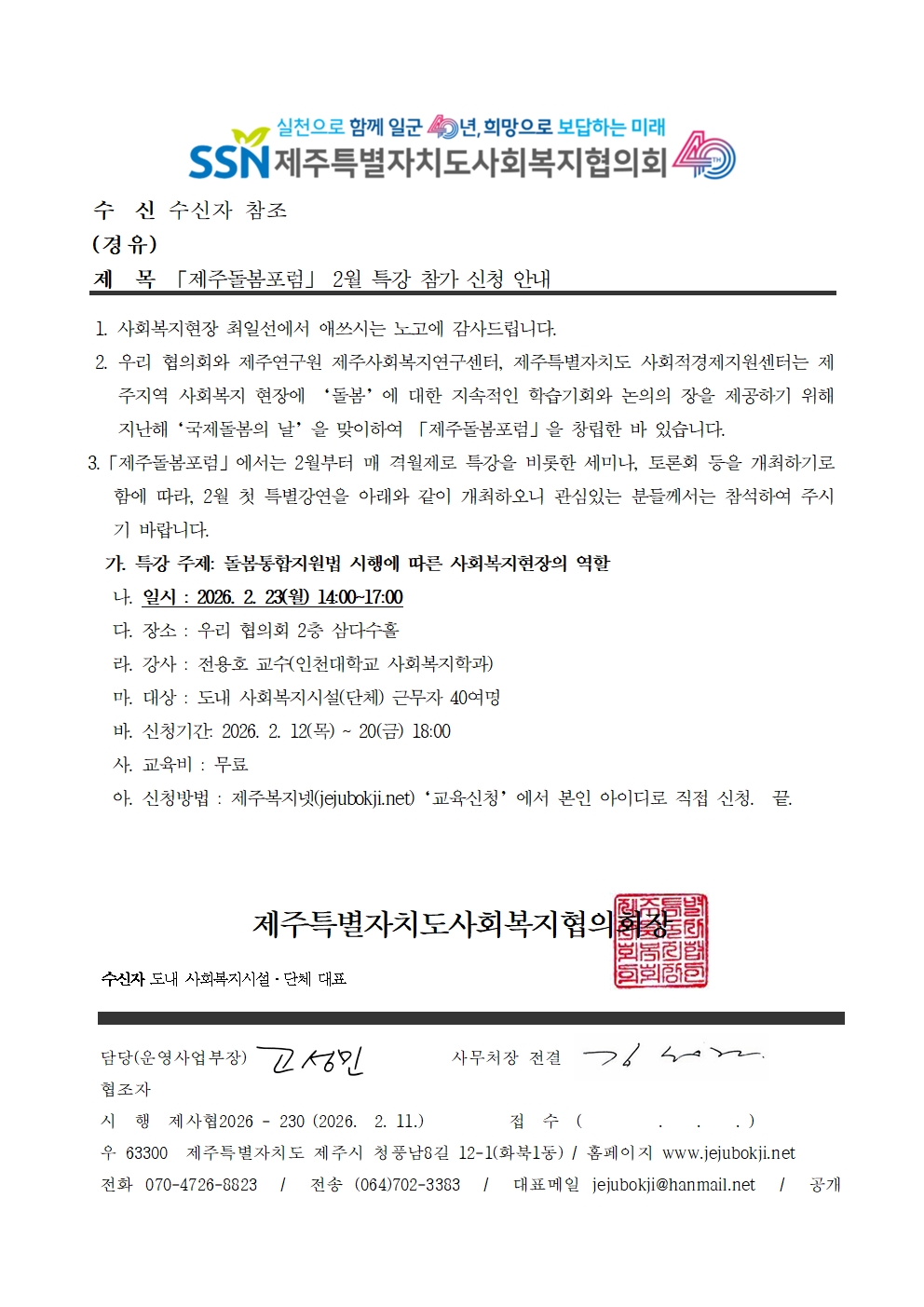 「제주돌봄포럼」 2월 특강 참가 신청 안내