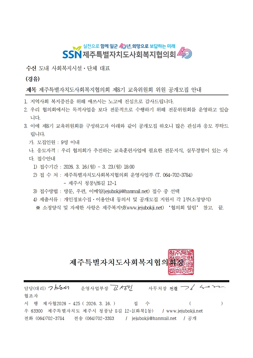 제주특별자치도사회복지협의회 제8기 교육위원회 위원 공개모집 안내