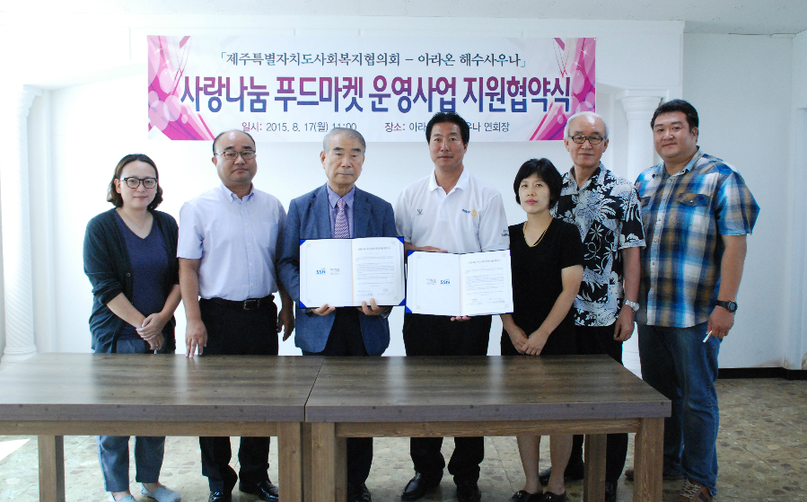 제주특별자치도사회복지협의회(회장 고치환)와 아라온 해수사우나(대표 장승남)가 8월 17일 푸드마켓 운영사업 지원 및 상호협력에 대한 협약을 체결했습니다.