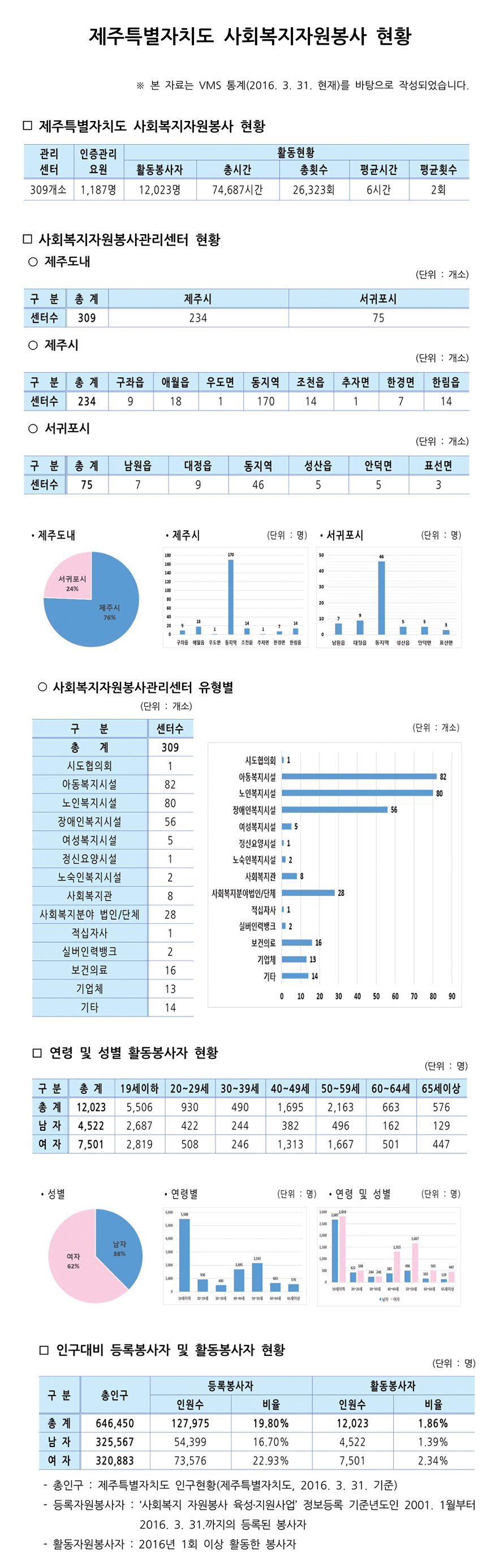 제주특별자치도 자원봉사현황(2016. 3. 31 기준)