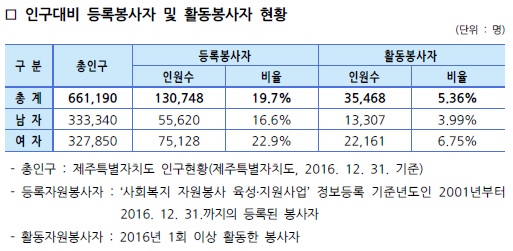 제주특별자치도 자원봉사현황(2016. 12. 31. 기준)