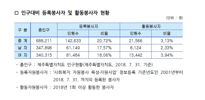 제주특별자치도 자원봉사현황(2018. 7. 31 기준)