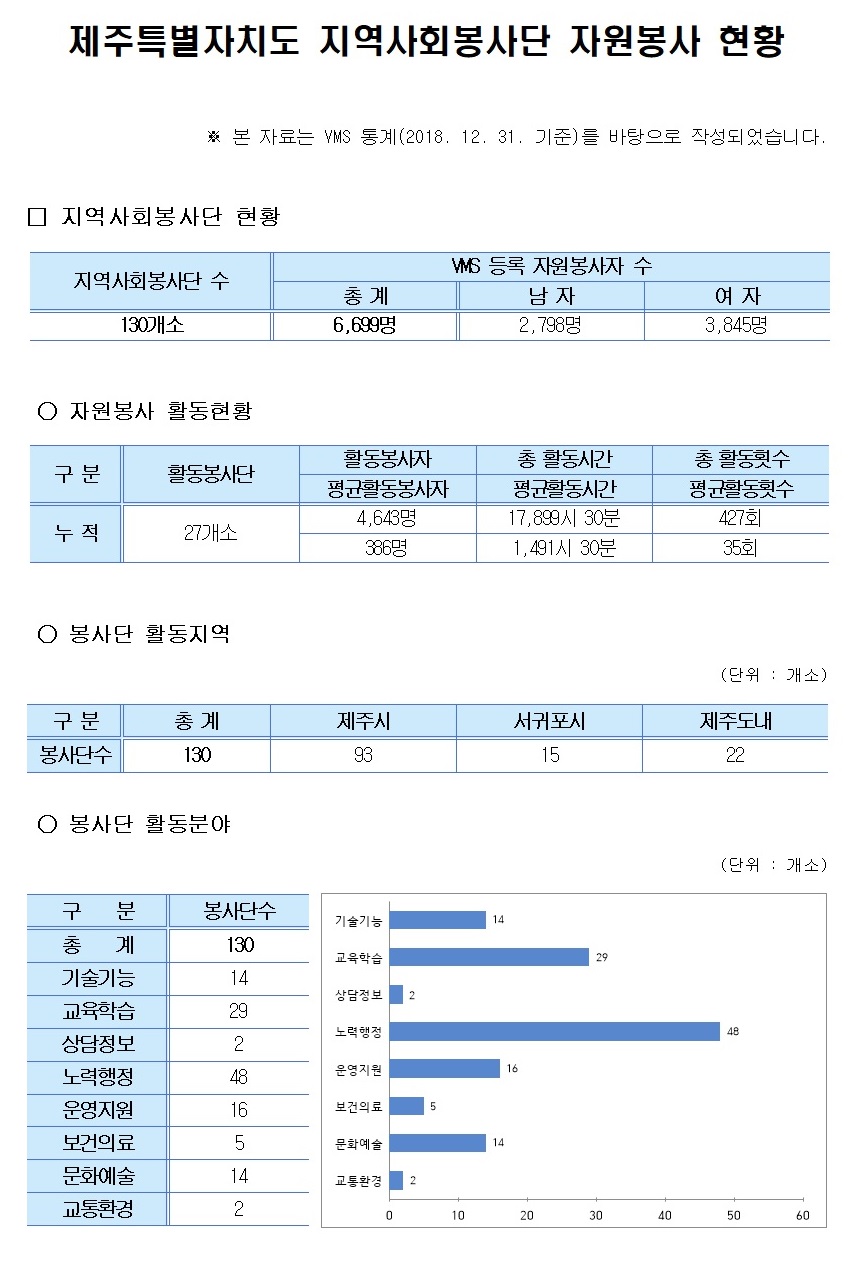 제주특별자치도 지역사회봉사단 자원봉사 현황(2018. 12. 31 기준)