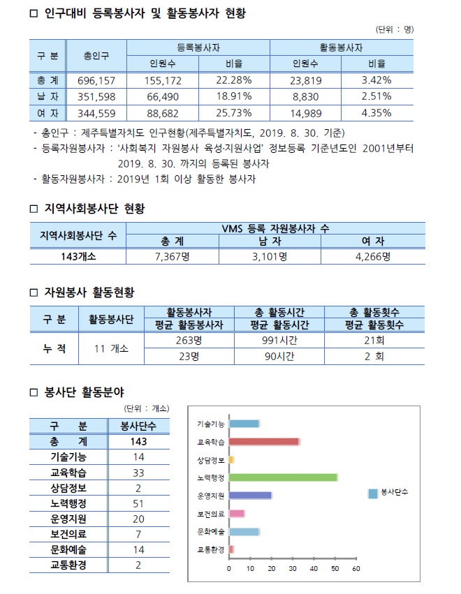 제주특별자치도 자원봉사현황(2019. 8. 30기준)