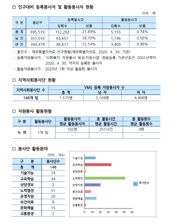 제주특별자치도 자원봉사현황(2020. 4. 30 기준)