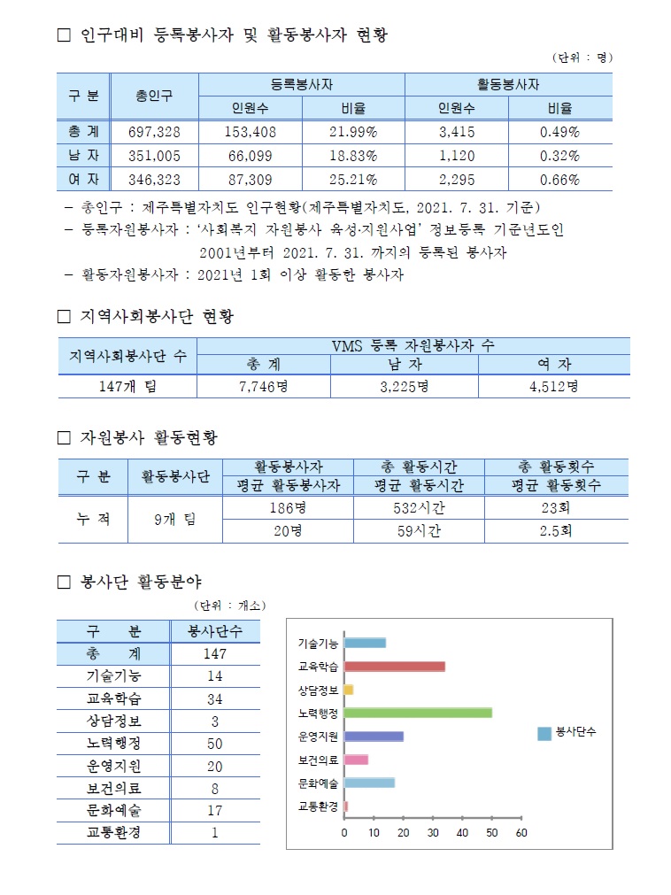 제주특별자치도 자원봉사현황(2021. 7. 31 기준)