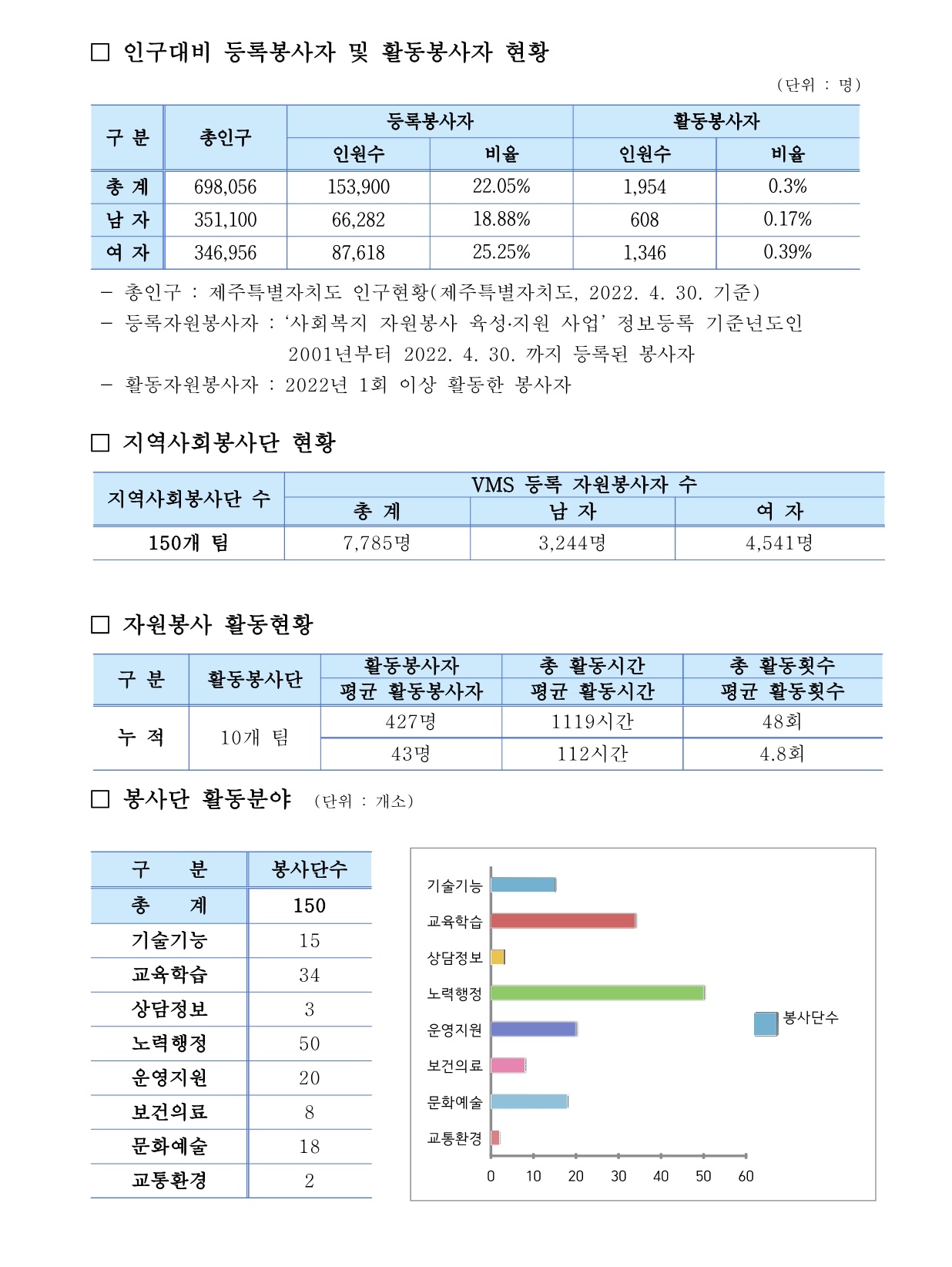 제주특별자치도 자원봉사현황 (2022. 4. 30 기준)