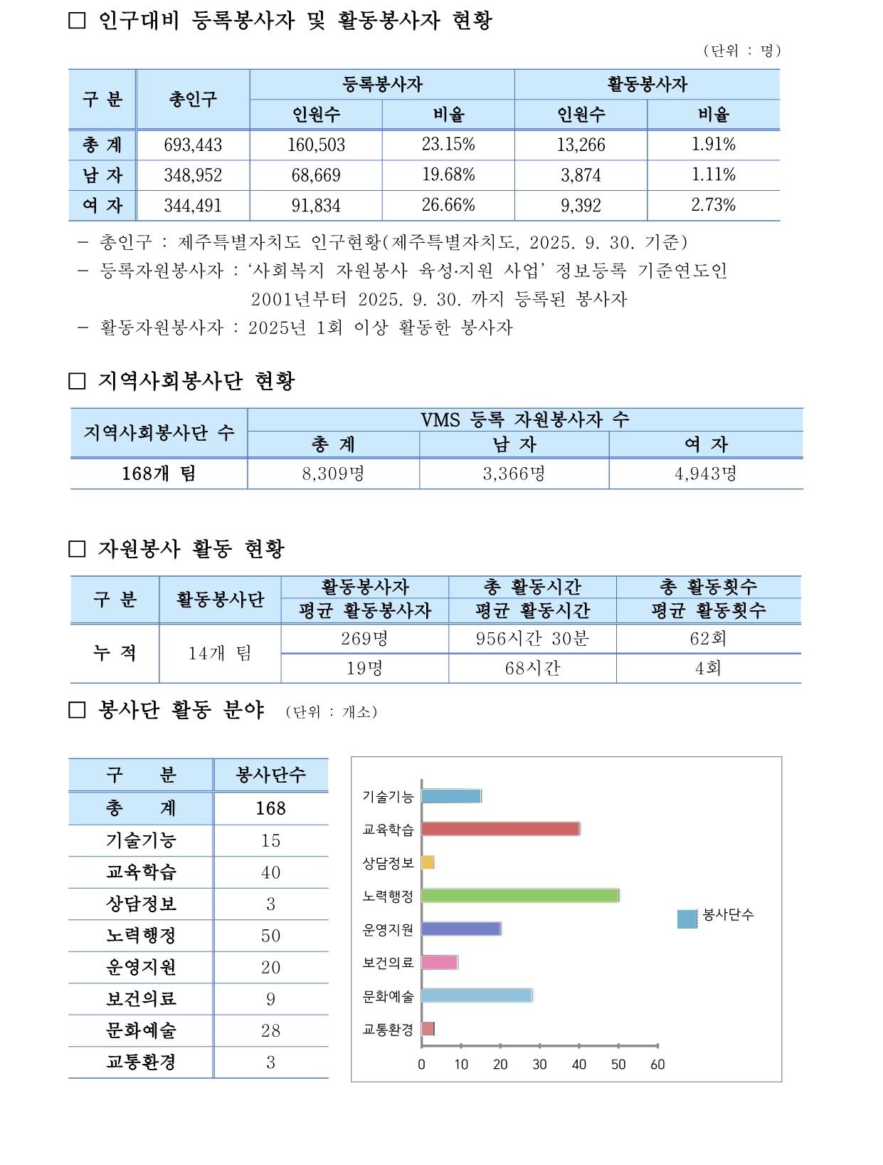 제주특별자치도 자원봉사현황 (2025. 9. 30. 기준)