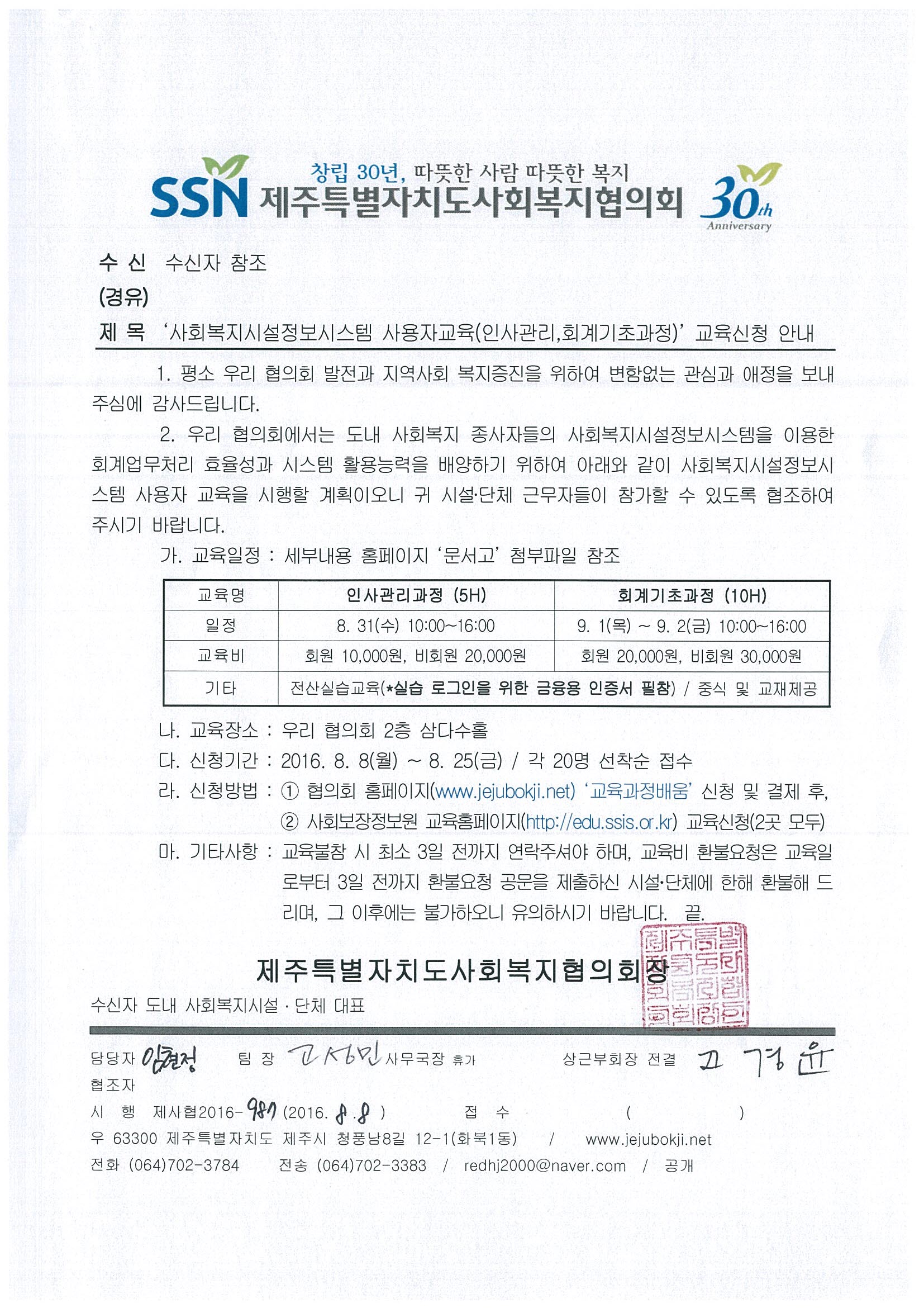 | 교육내용 | **세부내용은 첨부파일 참조 1. 개인인증서(금융용)가 저장된 USB 필수 지참(실습 시, 로그인 방식 변경) 2. 교육 신청인원 기준(10명) 미달 시 폐강됩니다. 3. 업무교육이 아닌 시스템 활용 실습교육입니다. 4. 수료증 발급은 2주 이내에 “사회보장정보원 교육홈페이지“에서 발급 가능합니다. 5. 교육 신청은 제주특별자치도사회복지협의회(www.jejubokji.net) 교육 신청 후, 사회보장정보원 교육홈페이지(http://edu.ssis.or.kr) 신청바랍니다. 6. 주차장은 본 협의회 또는 화북성당 지나 대형 공터 주차장을 이용해주시기 바랍니다. 7. 환경보호를 위해 일회용 종이컵 사용을 줄이고자 하오니, 가급적 개인컵 준비 부탁드립니다. |